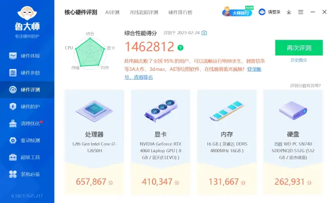 这次测试在win11开启高性能,神舟Control Center 为性能模式下进行。 (1)电脑配置: 操作系统 Windows 11 家庭版 64位(Version 22H2 / Direct 处理器 12th Gen Intel Core i7-12650H 主板 神舟 CV15S(LPC Controller - 5182) 显卡 NVIDIA GeForce RTX 4060 Laptop GPU ( 8 GB / 蓝天(CLEVO) ) 内存 16 GB ( 英睿达 DDR5 4800MHz 16GB ) 主硬盘 西数 WD PC SN740 SDDPNQD-512G (512 GB / 固态硬盘) 显示器 CSO1509 ( 15.5 英寸 ) 声卡 瑞昱 High Definition Audio 网卡 英特尔 Wi-Fi 6 AX201 160MHz (2)变量:内存条 显卡模式 1. 16GB 单条 显卡:混合模式