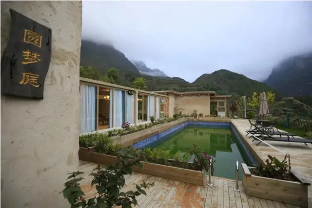 在层峦叠嶂、四面笼翠的高山之巅,山湾.梦谷地理位置得天独厚,视野绝佳。走在园区中木板、石子铺成的小路上,田园般自然清新的气息扑面而来,土墙、原木、玻璃、阳光、泳池,甚至一束小花,一串辣椒,总有惊喜在不经意间等着你,处处显露出古朴厚重而又超凡脱俗的情趣雅致。