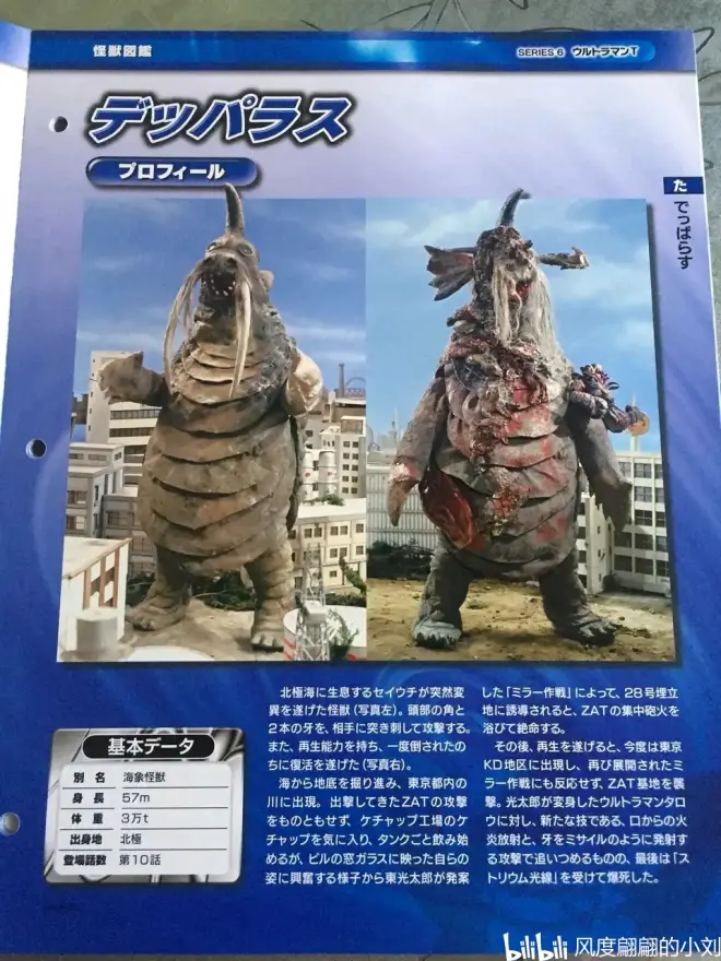 德帕拉斯以海象为原型进行造型创作。 德帕拉斯,原本只是生活在北极海域一带的普通海象,由于突然变异而成为了怪兽。德帕拉斯在海底四处活动时,挖通了到达东京地底的通道,并从东京都内的河流中现身。德帕拉斯在市内横冲直撞,由于爱吃番茄酱还袭击了番茄酱工厂。 ZAT出动迎战怪兽,但因为德帕拉斯的皮肤太厚实,导弹无法对其造成伤害。东光太郎在战斗中坠机,还被德帕拉斯追逐,但却发现了德帕拉斯会兴奋地攻击建筑玻璃映照出自己的镜像,于是利用这一点展开「镜子作战」,用大型镜幕将德帕拉斯诱导至28号大型废坑中,再以强力导弹集中攻击,杀死了德帕拉斯。 不久后,德帕拉斯凭借再生能力复活,并在东京KD地区展开破坏。ZAT再次进行「镜子作战」,但再生德帕拉斯无视了镜子的存在,还径直袭击到了ZAT总部。眼见ZAT无法阻止再生德帕拉斯的行动,东光太郎赶往现场,变身为泰罗奥特曼参战。再生德帕拉斯以火焰放射和导弹獠牙的攻击一度令泰罗受挫,但最终败给了泰罗,并被「斯特利姆光线」炸得粉碎。德帕拉斯残存的2根獠牙,被泰罗组合成了十字状,作为德帕拉斯的墓碑。 海市蜃楼怪兽劳德拉