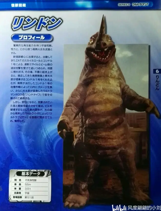 林顿的造型是以典型的独角恐龙型怪兽为主题创作;叫声沿用西蒙斯。 不死怪兽林顿,从宇宙来到地球后在地底沉睡了1000年,苏醒后出现于新宿副都心,对城市大肆破坏,性情十分凶暴。在ZAT出动迎战后,林顿遭到ZAT战斗机的导弹和镭射炮的波浪式组合猛攻而无法前进,于是伏倒在地面上以此来让ZAT大意,林顿趁机咬住了东光太郎和南原忠男驾驶的神鹰号,此举也让其他的ZAT队员们不敢轻易攻击。 为了消灭林顿,南原下决心引爆了神鹰号,而林顿也被爆炸炸伤。东光太郎趁机变身为泰罗奥特曼登场,从火焰中救出了南原,并和林顿展开战斗。一番激战后,林顿被泰罗使用「手掌刀刃」斩首身亡,尸体被放置在原地等待处理。但林顿有着再生能力,经过24小时的作用后完成了复活,再次对新宿街道展开破坏。 林顿经过再生修整后,破坏行为升级,还一路追杀着避难缓慢的南原的母亲和未婚妻,让空中的ZAT也不敢轻易攻击。最后,奥特之父从光之国飞来,使用「奥特翎羽」击中了林顿,林顿的全身组织都遭到翎羽释放的冲击波攻击,无法再生地被彻底粉碎消灭。