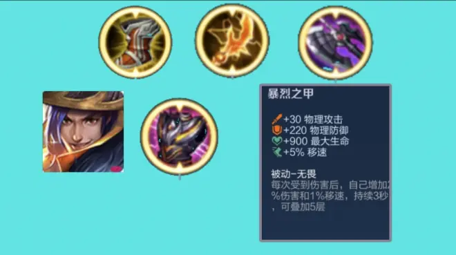 第五件装备,选择暴烈之甲,在这个时间段,对方的C位输出已经成型,此时的刘备应该增加生存能力,才能让三技能的护盾更具有性价比,暴烈之甲有物理防御,有生命加成,更重要的是拥有移动速度加成,被动的伤害以及移速加成,刘备也很容易触发。