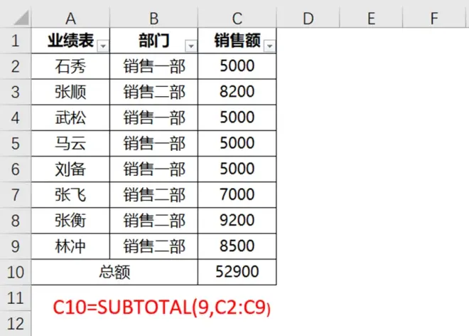如下图所示,筛选“销售一部”后,Subtotal只显示销售一部的求和数据。