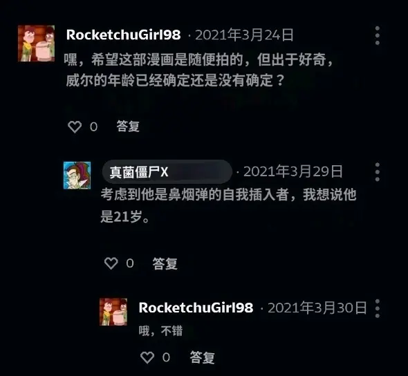 Will的年龄。。。我个人出于他是高中生的原因,我给他的年龄定在16,或者是17,但我更喜欢流前者,反正不会超过18() 但根据FungalZombieX所给的回复(如图),他的年龄是21,也可以给大家当作一个参考吧!!反正我这个烂人更喜欢我流的年龄()