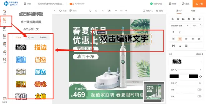在编辑页面中,双击其中的图文内容就能编辑,在右侧的工具中编辑选中的图文内容。