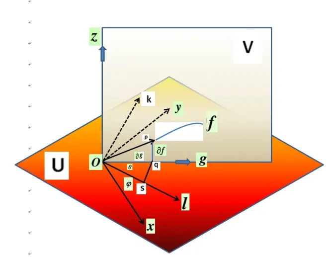 上图的og就是梯度方向,f 代表图1中的曲线 s。为了表明图1中的曲线 t 的方向导数是梯度方向og的一个分量,特意构建了另一个坐标系koL。图中的ok,oy,og,oL,ox都是在地平面U上面,而空间曲线 f 则在投影平面V上面。