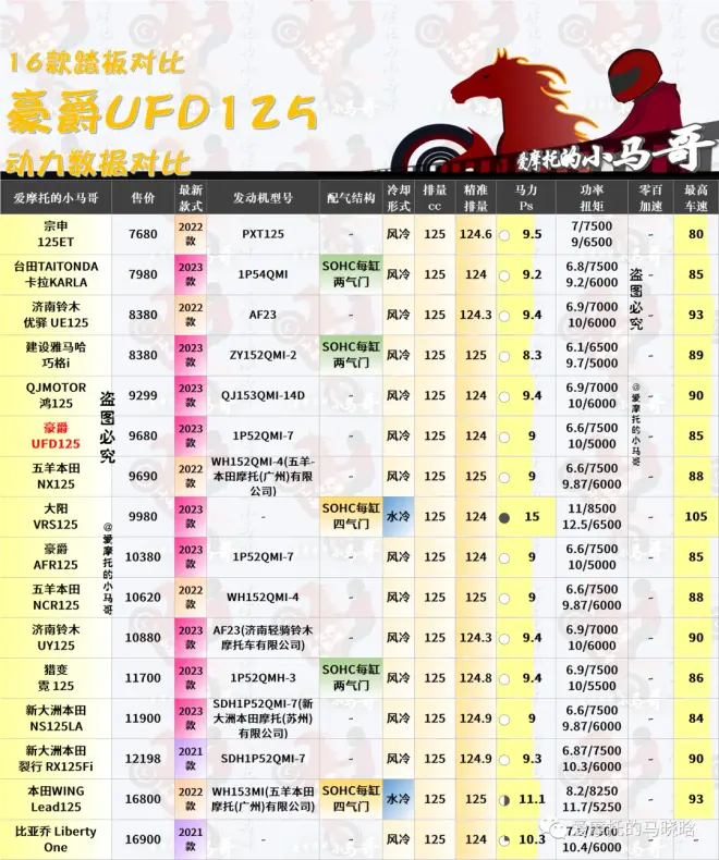 之前每次写QJ的文章我都会忍不住吐槽他家的套娃操作,但当把目光聚焦到豪爵的125小踏板上来之后,就会发现QJ家的套娃操作那都是弟弟!豪爵才是套娃界的鼻祖!从2019年开始到现在单单是125cc的小踏板豪爵就推出了21款!这还是不算那些已经停售的车型!简单的整理了一下现在在售的21款的动力参数,大家可以看看豪爵这霸气的阵仗