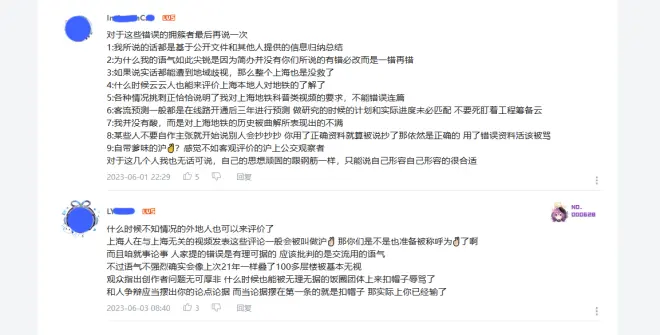 科普性(专业性)一直都是他们部分人对我作品的定位和要求,我当时(2023-05-03)也在该评论下回复过:“我也想做科普,但完全做不了(这类视频),只要城市有发展,规划就会有变化,没有所谓的绝对准确,只有不断的修正完善”。(节选详见话题1省流4)不仅于此,其圆子成员普遍从科普角度去标榜和指责其他“否定”其为“标准唯一”答案的观众。用户I所述:“各种情况挑刺正恰恰说明了我对申通地铁科普类视频的要求,不能错误连篇。”前面话题1省流7我也说了,能改有条件改的都改了并在6月2号更新了,但贯通圆子成员还是从科普的角度去对一个普通生活出行类的视频评价和“挑刺”,我认为的有待商榷。
