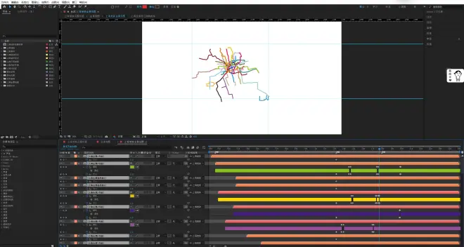 举个例子:制作好的工程文件按22号线计划2022年开通、23号线计划2023年开通、24号线计划2024年开通,突然公告22号线搁置暂不开通,那么演示2022年的时候就不能出现22号线,原本22号线出现的时间是20秒,那剔除22号线后,这20秒只能靠后面线路往前移动补位,随着线路的变化,与其关联的线路标识、文字说明、里程、车站、年份、日期、全景地图、已有线路、换乘车站等等全部都要手动调整,基本是很难完成的,可能会越调越乱。