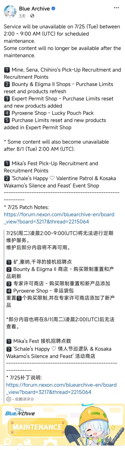 蔚蓝档案国际服将于7月25日凌晨2:00-9:00进行维护