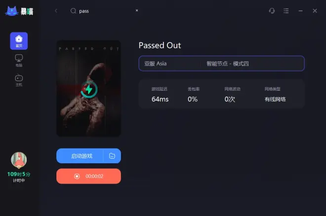 1,下载并打开暴喵加速工具,在加速客户端搜索Passed Out并选择亚服进行加速完,然后点击启动游戏进入