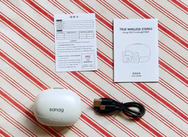 包装盒内拿出全部的物件有:sanag Z65S Pro×1,USB Type-A to USB Type-C充电线×1,使用指南说明×1,保修卡×1。