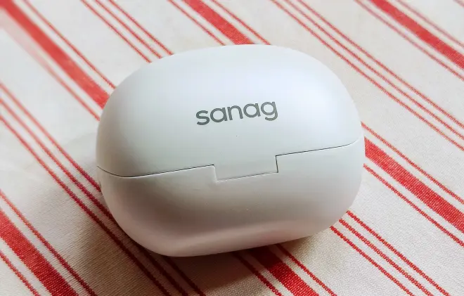 哑光质感的耳机盒,在白色的机身上也仅有sanag(塞那)的英文logo点缀。