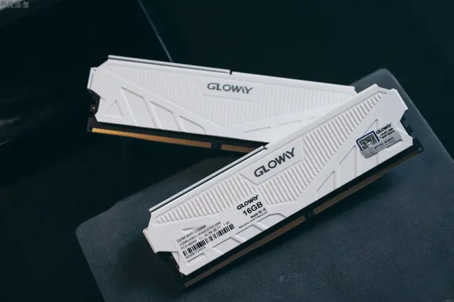 相比于常见的黑色马甲,光威天策DDR5 6000的皓月白配色涂装马甲确实更好看一些,而且做工不错,表面有压纹处理,看起来十分精致,马甲两端采用了折弯锁扣工艺,结实稳固,它上面当然也少不了光威GLOWAY等标志性元素。