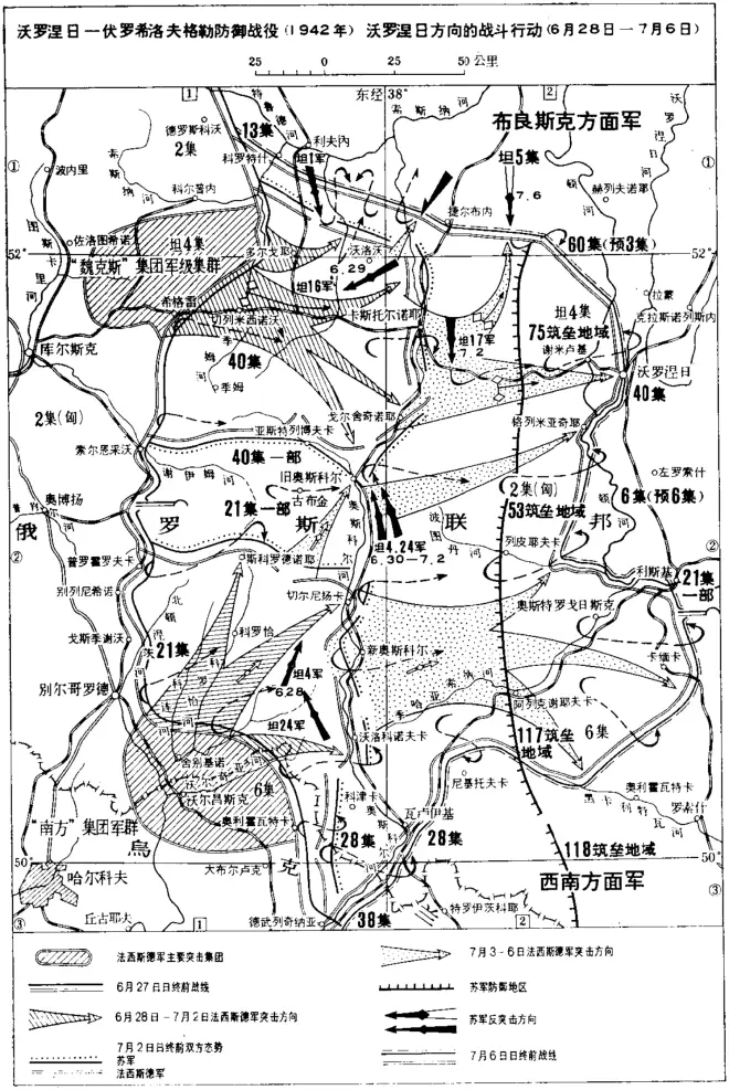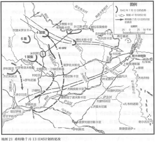德军前进的速度也越来越慢:7月17—31日,第6集团军向东推进55—70公里,平均每天4—5公里;8月1—19日,只前进了30—35公里,平均每天1.5—1.75公里。