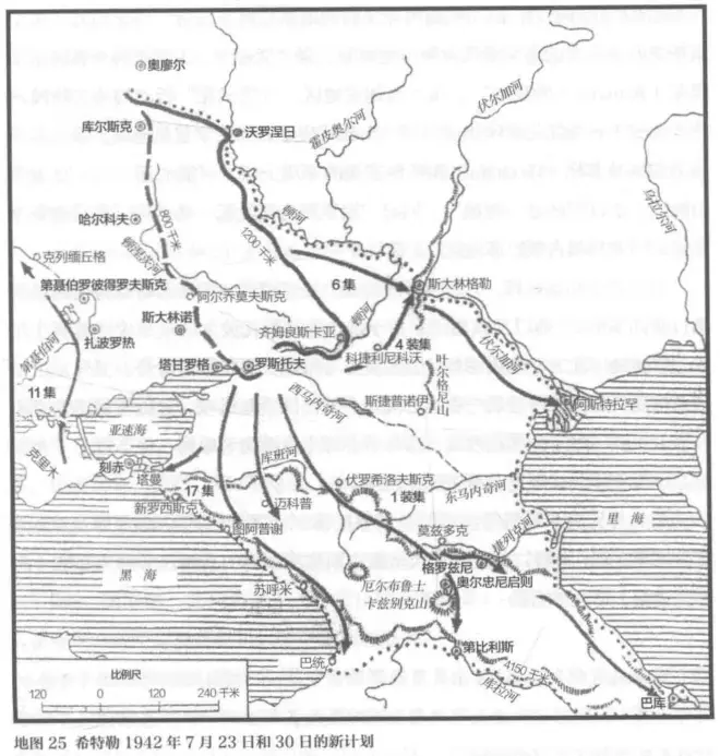 希特勒的这一决策是严重脱离实际的,因为它本来就是建立在所谓“俄国人已经势穷力竭”这一错误认识的基础上的。实际上,B、A两个集团军群在罗斯托夫—齐姆良斯卡亚—沃罗涅日的战线就已经长约750英里,如要到达它们所计划的巴统—巴库—阿斯特拉罕—斯大林格勒—沃罗涅日一线,那么战线将长达约2500英里。而且尽管德军不断减员、缺乏急需的替换部队和燃料经常短缺,这条战线还得守住。随着德军离军需车站越来越远,他们需要的汽油越来越缺乏。少数情况下,德国空军会将一桶桶燃料运至前进机场,但这只是杯水车薪。在“蓝色3号”行动期间,第6集团军就因为缺乏燃料已暂时停顿下来。况且,尽管德军已在宽大正面上进抵顿河下游,并在数处强渡了该河,但要到高加索最北的石油区还有遥远的路程:到迈科普还有350公里,到格罗兹尼尚有750公里,而在到达巴库、第比利斯和巴统之前,先要越过宽度与阿尔卑斯山相同、高度却超过它的高加索山脉。