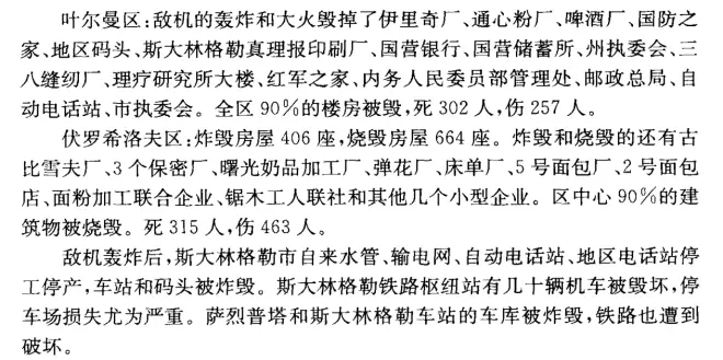 最贵重的企业设备也拆下来运过伏尔加河。8月29日至9月10日,从“红十月”厂经伏尔加河运出来的、有重要价值的物资计有3条设备线,车皮铁合金,车皮有色金属和车皮辅助材料。这个厂还向车里雅宾斯克派去了5000名工人和工程技术人员,开办了新的钢铁厂。9月9日从拖拉机厂运出了350吨有色金属、大约200吨的设备器材和仪表,其他企业里也运出了大量有色金属。