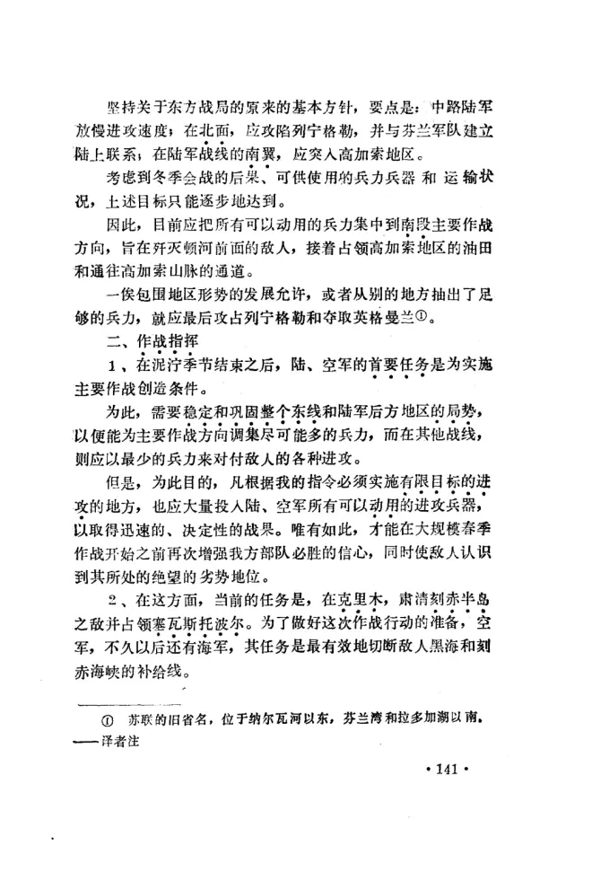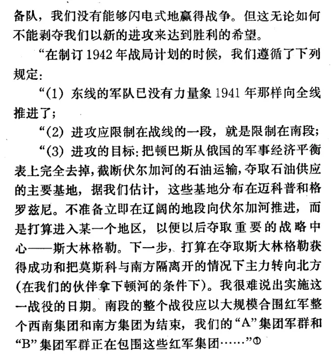 1942年1月3日,希特勒在与日本大使大岛浩谈话时指出:“一旦天气好转,我的目标仍是进攻高加索。这一突击方向是最重要的方向;必须搞到石油区,到达伊朗和伊拉克,一旦能在那里立足,就有希望给阿拉伯世界的自由运动以帮助。自然,我也将尽一切力量,摧毁莫斯科和列宁格勒。”