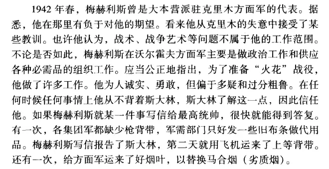 经过这次挫折后,梅赫利斯认真吸取了教训。1942年12月8日他担任沃尔霍夫方面军军事委员会委员后,就再也没有犯眼高手低的错误,积极进行部队的政治工作和供应各种必需品的组织工作,并受到了方面军司令员梅列茨科夫的好评:
