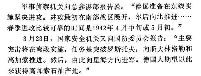 苏联情报部门侦知了敌人将在南方发动主要突击的意图,并向总参谋部和国防委员会作了报告: