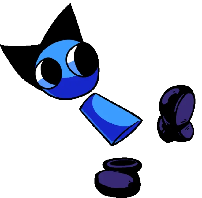 Fabs is a blue figure that has a circular head with black triangular cat ears, a rectangular body and black shoes, all of which float separately from one another.(Fabs是一个蓝色的人形,有一个圆形的头和黑色三角形的猫耳朵,一个矩形的身体和黑色的鞋子,所有这些都是分开漂浮的。)