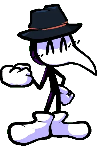 (MonotoneDoc是一个戴着白色手套和鞋子的小黑色火柴人,脸上戴着白色的鼠疫医生面具,头上戴着一顶深灰色的软呢帽,上面有一条棕色的条纹。)