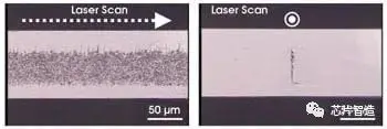 图 4.低 k 器件芯片被激光烧蚀法(上图)和隐形切割法(下图)切割。