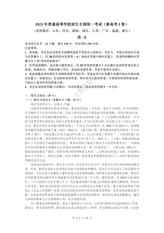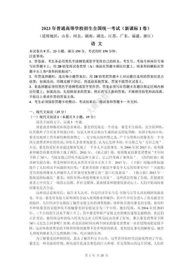 以下为2023年全国新高考新课标一卷语文试题真题及详细答案解析(如需相应文档请搜索同名公众号联系作者):