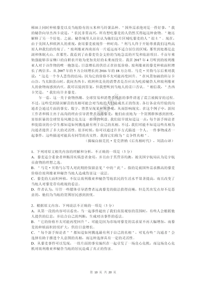 现代文阅读里的第一篇为信息类文本阅读,摘编自赫克托·麦克唐纳的《后真相时代》,通过对给出材料的阅读,引导学生应深入思考信息时代中,理性分析和审慎判断的重要性。