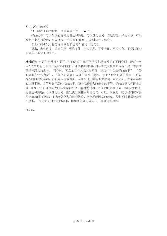 写作为材料作文,主题是“故事的力量”,旨在引导学生思考“故事”这一载体所蕴含的事实、形象、道理等,以及“什么是好故事”,“如何讲好故事”的重要作用和意义。