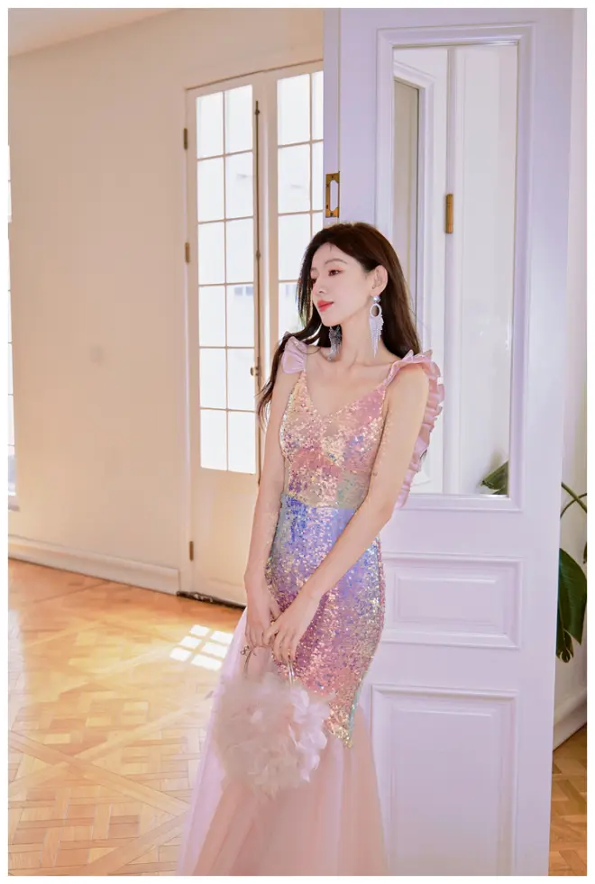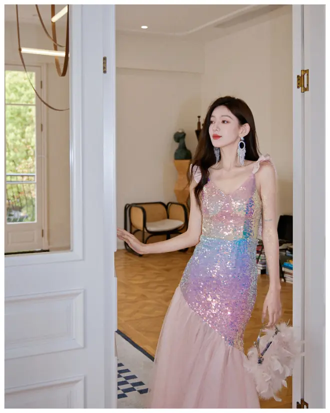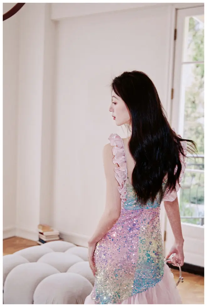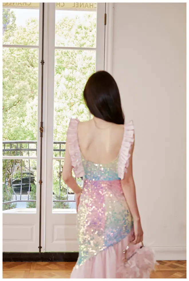 » dollytang朵家 搁浅人鱼姬幻彩亮片连衣裙设计感露背鱼尾裙小礼服
