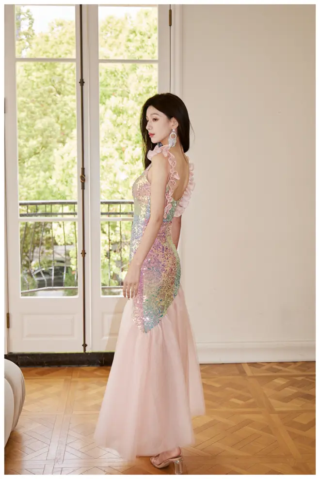 dollytang朵家 搁浅人鱼姬幻彩亮片连衣裙设计感露背鱼尾裙小礼服