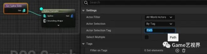 我们将添加样条数据和样条采样器的另一个组合但在这种情况下我们将设置样条数据的标签到路径,所以它只能在通过时拾取