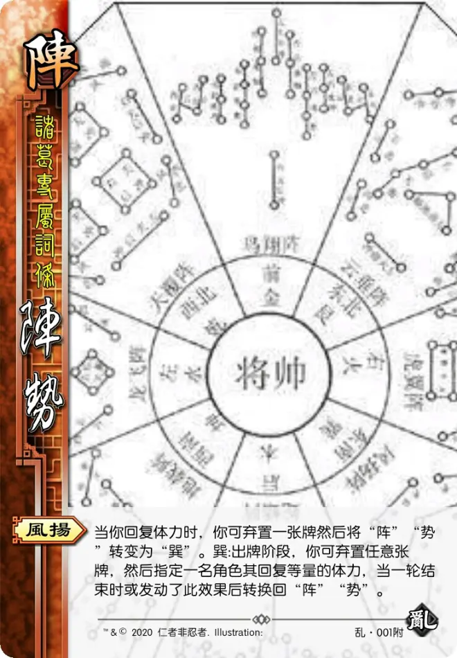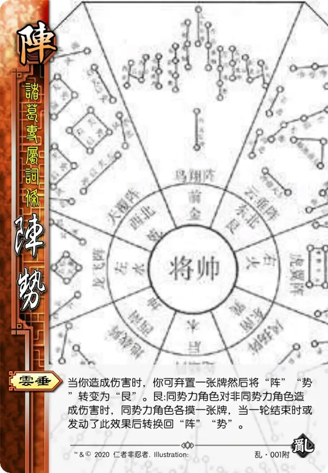 阵,势,转变,转换:特殊标记,拥有此标记的角色可在对应时机发动将阵/势变为对应的阵法,转变则是以此或技能转变为指定的阵法,转换就是达成条件后会阵法会变回阵/势,且我方已有角色进行转变后,其他角色随机转变时不会转变为相同阵法,也无法触发相应的转变时机。