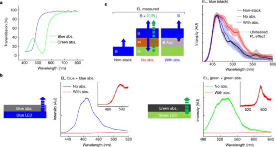 研究者设计了基于PI的蓝色和绿色光学吸收体,并将它们分别作为G/B和R/G LED之间的粘合剂夹层插入,以阻挡向下的发射。如图3a的光学透射光谱所示,蓝色和绿色吸收剂分别被设计为强烈吸收蓝光(约460nm)和绿光(约540nm)。图3b证实了作为LEDs上的涂层,它们可以完全熄灭各自的目标颜色发射,同时透射90%以上的非目标颜色发射。图3c显示了它们在垂直堆叠配置中防止PL的有效性。尽管在通过PI层堆叠在绿色LED上的EL光谱中观察到绿色PL,但在包含蓝色吸收层的器件的EL光谱上不存在绿色PL。这些基于PI的吸收体结合层在减小垂直μLEDs的组合厚度方面起着关键作用。