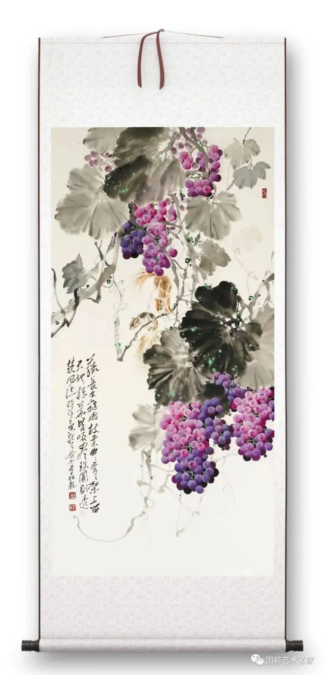 随风而动,伴随着果香阵阵,葡萄同时也代表硕果丰收,多子多孙的意寓。如此一幅有文化、有内涵的国画作品,挂在家里也可彰显高雅品味。也是件难得的收藏品。