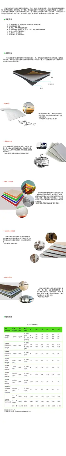 PET发泡材料是一种具有闭孔结构的、可再生的热塑性聚合物泡沫。它具有阻燃、防烟、无毒等优良性能。PET发泡材料还具有优异的机械和抗疲劳性、化学稳定性、抗紫外线和低吸水性。高温后固化后,化学稳定性好,无后膨胀,力学性能大大提高,特别是的剪切伸长率显著提高。PET发泡材料板可用于风力叶片、轨道交通、船舶、建筑材料、装饰材料和工业应用中的夹层材料。