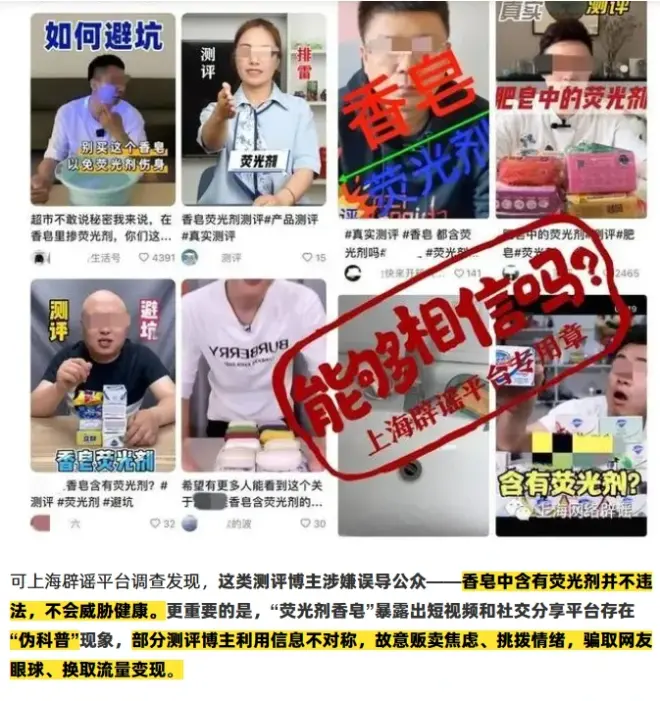 在花爸发布“荧光剂CBS无毒害”视频之后,上海官方平台“上海网络辟谣”也发文了,指出香皂含荧光剂并不违法,更不毒害健康,还批评了短视频平台的伪科普博主。