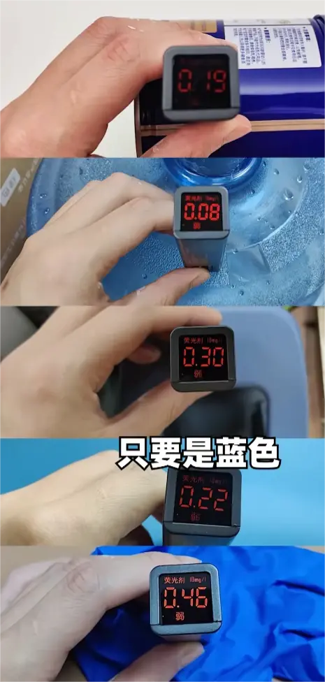 于是花爸拿着荧光笔在办公室四处转悠,将蓝色物体测了个遍,发现它们无一例外地被判定为“含有荧光剂”。例如:蓝色食品罐、蓝色水桶、蓝色订书机,甚至蓝色的丁腈手套......