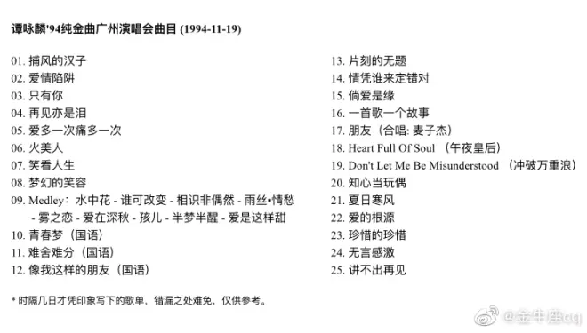 1994.9.4/9.5 '纯金曲'番禺英东体育场露天演唱会 两场。 番禺是2000年5月21号才并入广州,成为广州的一个区。