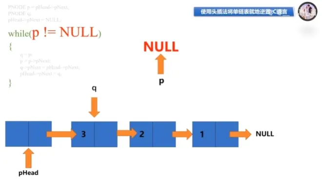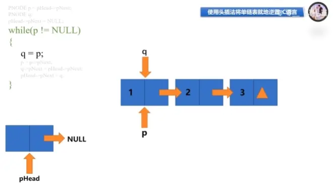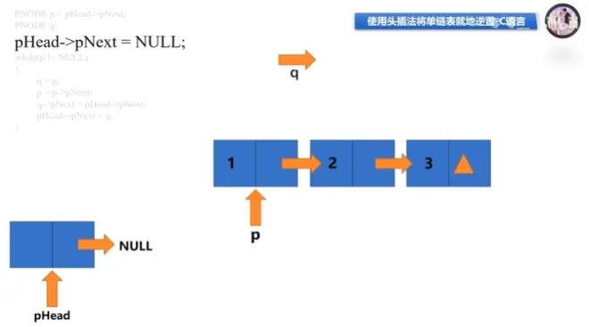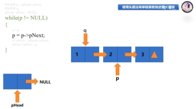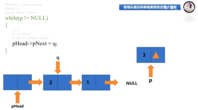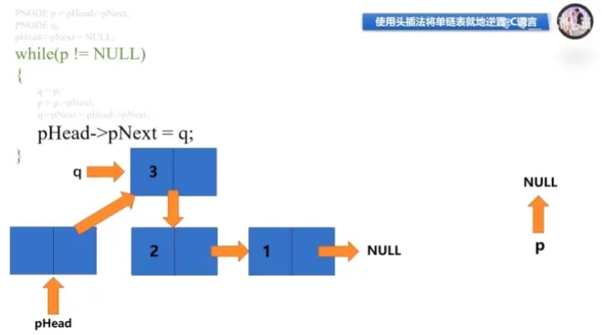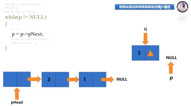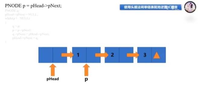 再逐个插入逆置链表的表头(即“头插”到逆置链表中),使它成为逆置链表的“新”的第一个结点,