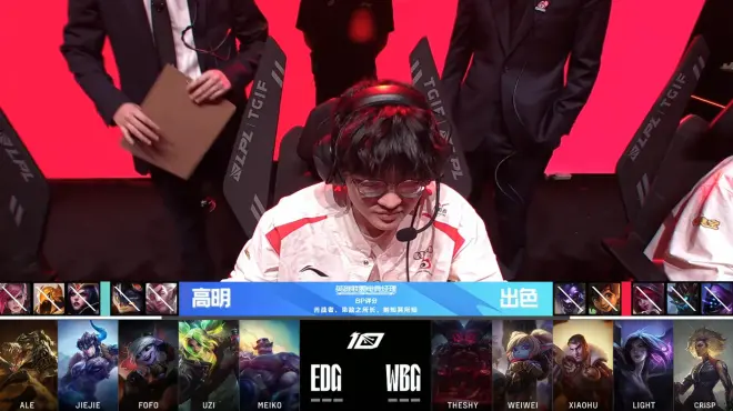 第一局比赛,EDG继续选择了他们“熟练”的双射手体系;而WBG则是掏出了杰斯和卡莎的双C组合来应对。