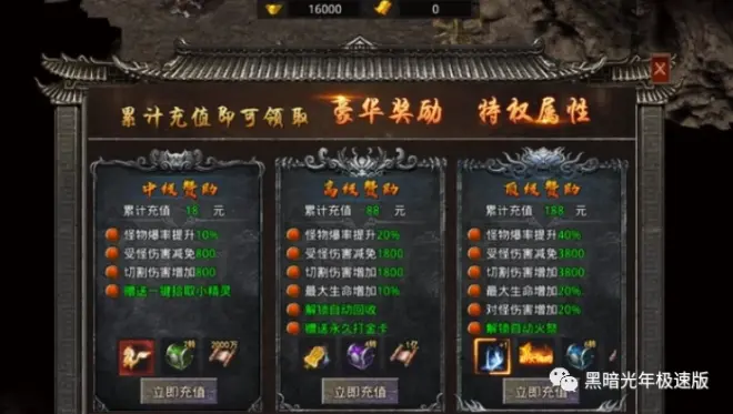 然后,让我们来谈谈唯一赞助。在《自由之刃2》中,唯一赞助分为中级、高级和顶级三种类型,每种类型都能解锁不同的特权。一键拾取、背包装备自动回收、永久打金卡解绑回收的灵符以及转生材料套装等特权,都能够使你在游戏中更加轻松便捷地提升实力。而且,这些特权是累充的,不需要额外花费灵符购买,所以我建议各位玩家直接升级到顶级赞助,这样能够更快地领先他人,给自己带来更好的游戏体验。