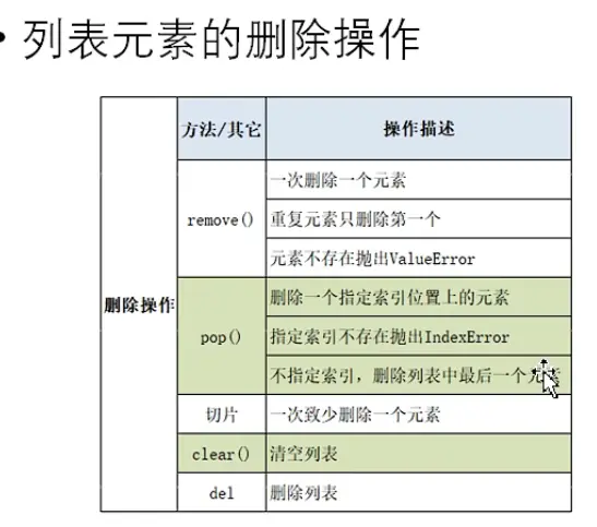 - 删除 remove() pop() clear() del 切片[ star: end :sep]
