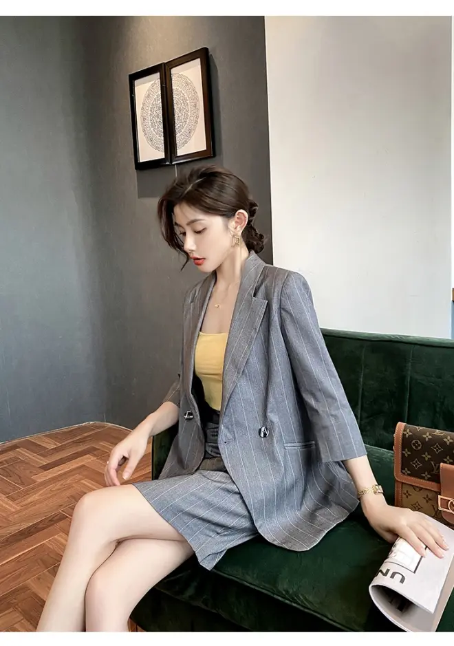 » 初九studios同款 版型jue 灰色条纹西装套装女高级感美容院工作服