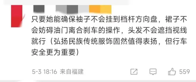 ——但是,也有人会担心,汉服的宽袍大袖和长裙,会不会给驾驶带来不便,产生安全隐患?