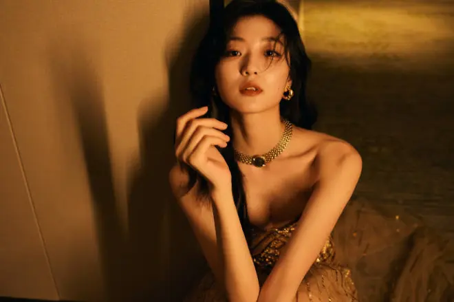 照片中的她,身穿金色低胸裙,五官精致,状态能打,蜷缩在墙角摆拍,两眼炯炯有神,被昏黄的灯光照射,气氛感满满。