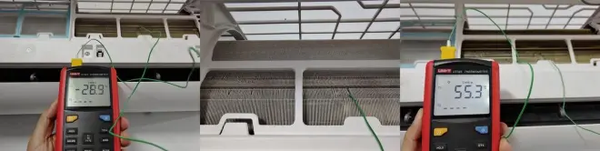 针对酷省电空调自清洁过程进行了实测,清洁过程中蒸发器和翅片温度可以达到55℃以上的高温,对于清洁效果完全不用担心。