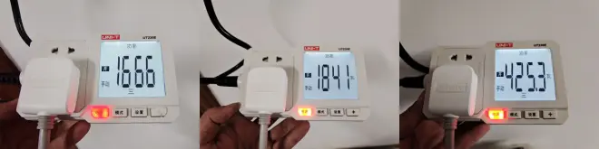 空调制热设置为20℃、开机后电辅热介入,功率快速到达1600w以上,最高功率1841w。