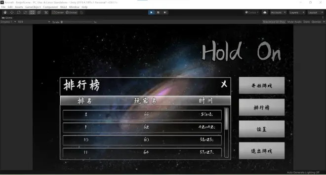 游戏一共有两个场景,分别为开始场景和游戏场景,玩家在开始场景点击开始游戏按钮后,进入选角面板,共有五种不同的飞机供玩家选择,玩家选择完成后,动态生成游戏对象,玩家飞机死亡后,输入名字,将游戏成绩记录至排行榜中。整个游戏使用了XML配置文件、NGUI拼接面板。