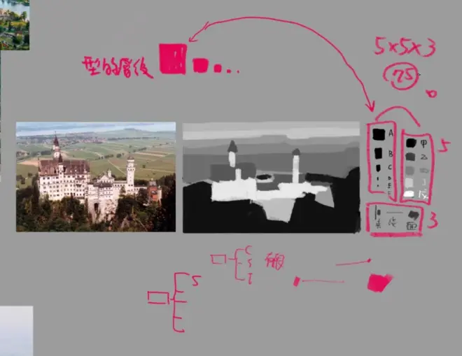 在上次课线的层级的基础上,本次课K大又添加了形的层级(浅谈概括),并从上节课的飞行道具引出其背后双主角的概念,进行深入阐述,最后讲了一下形的层级在色彩上的应用。